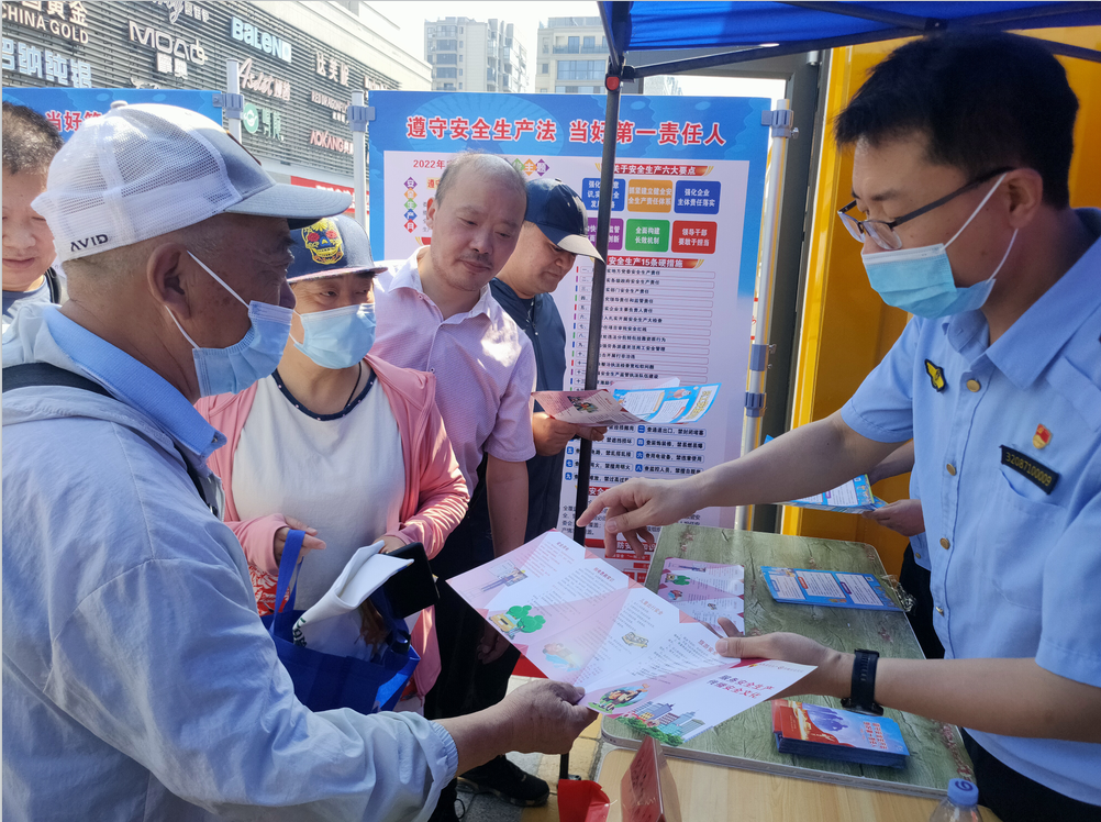 活动现场播放《生命重于泰山》宣传片,宣传习近平总书记关于安全生产重要论述和指示批示精神;以《安全生产法》、《安全生产十五条硬措施》、《安全生产主体责任二十条》等宣传展板,发放安全生产宣传包、安全法七叶扇等形式提高“安全生产咨询日”群众的参与度、认知度。
